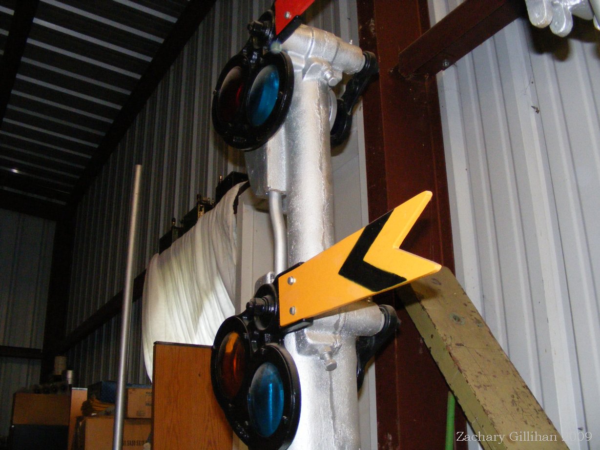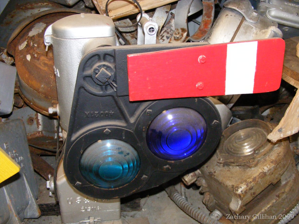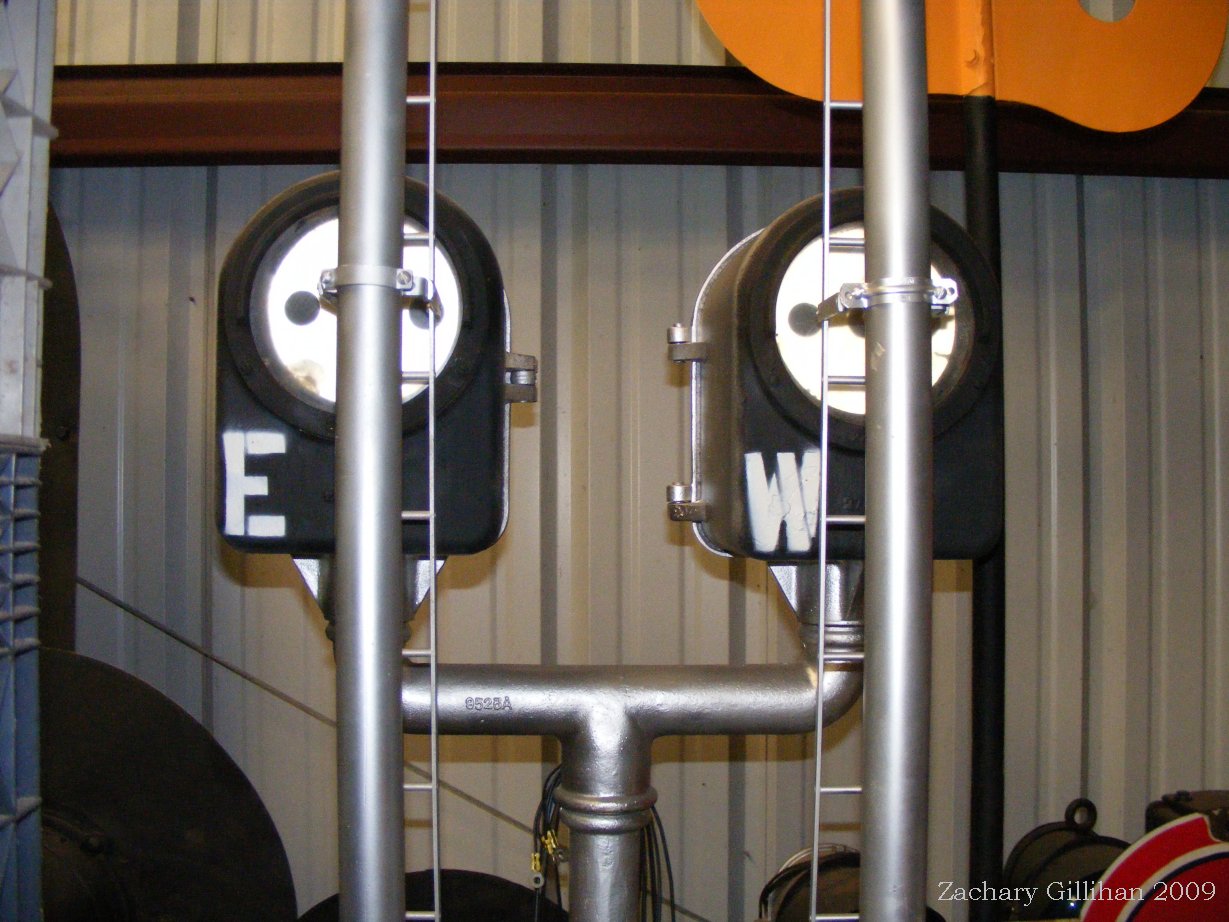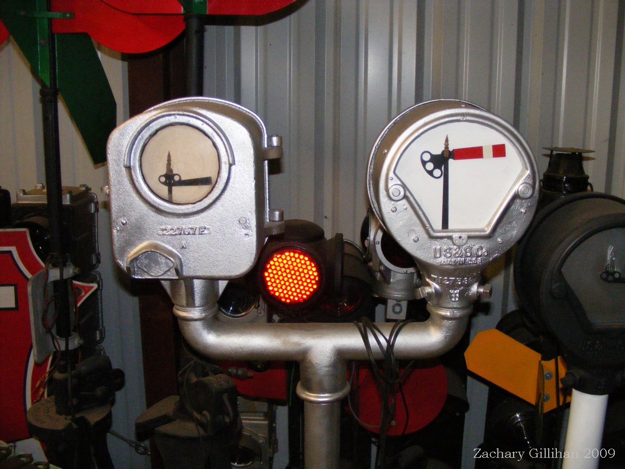 The signal to the left is a US&S Co pnuematic lower quadrant dwarf semaphore off the Chicago Transit Authority. The signal on the right is a dwarf mechanical semaphore off the old New York, New Haven & Hartford railroad and is a George Stiles Co dwarf semaphore. |
