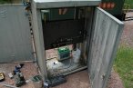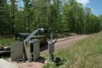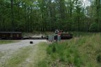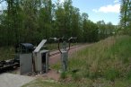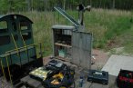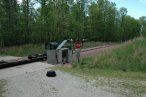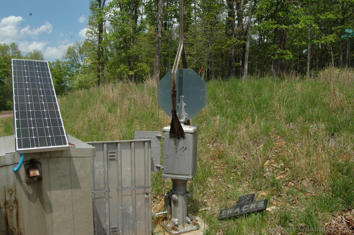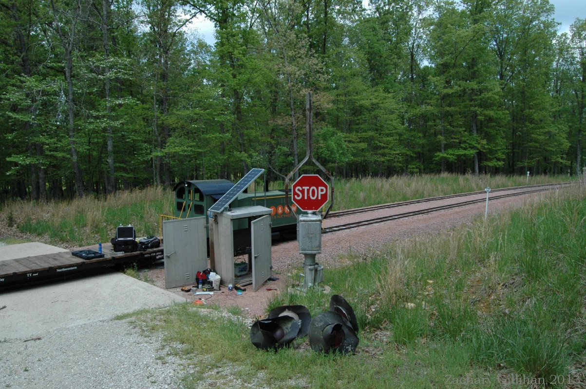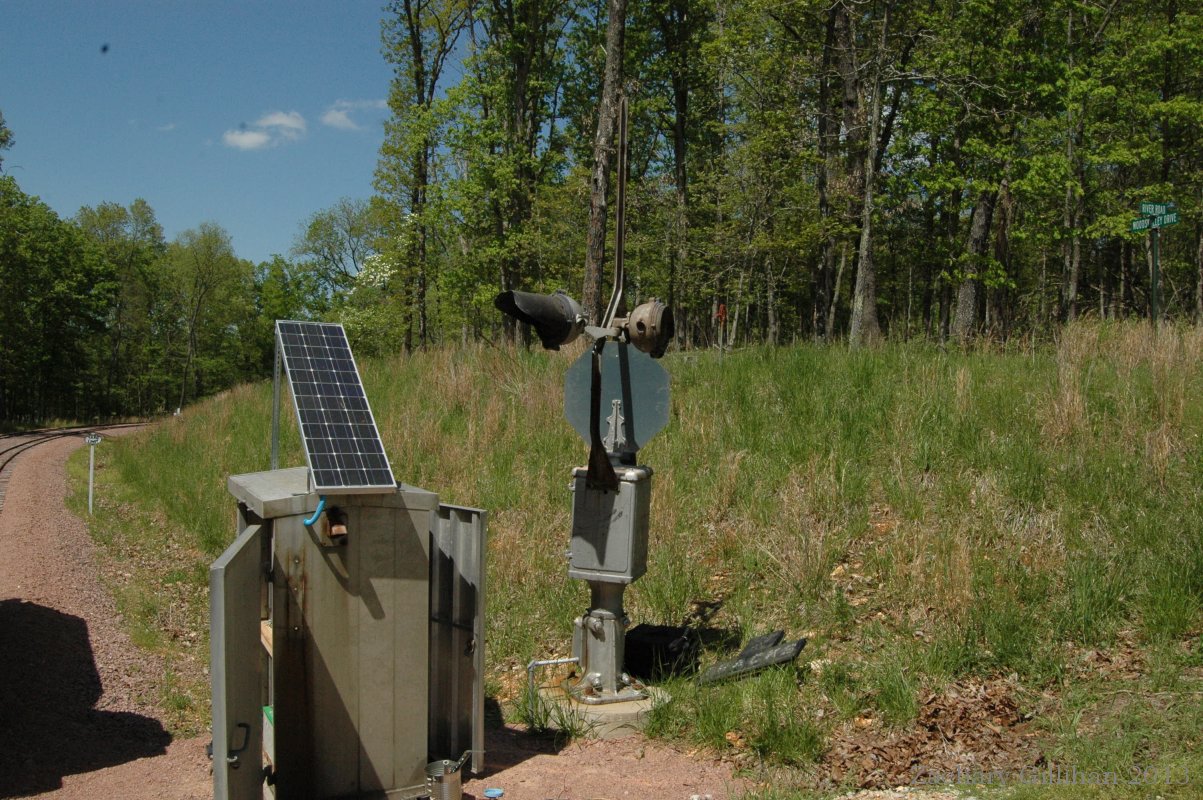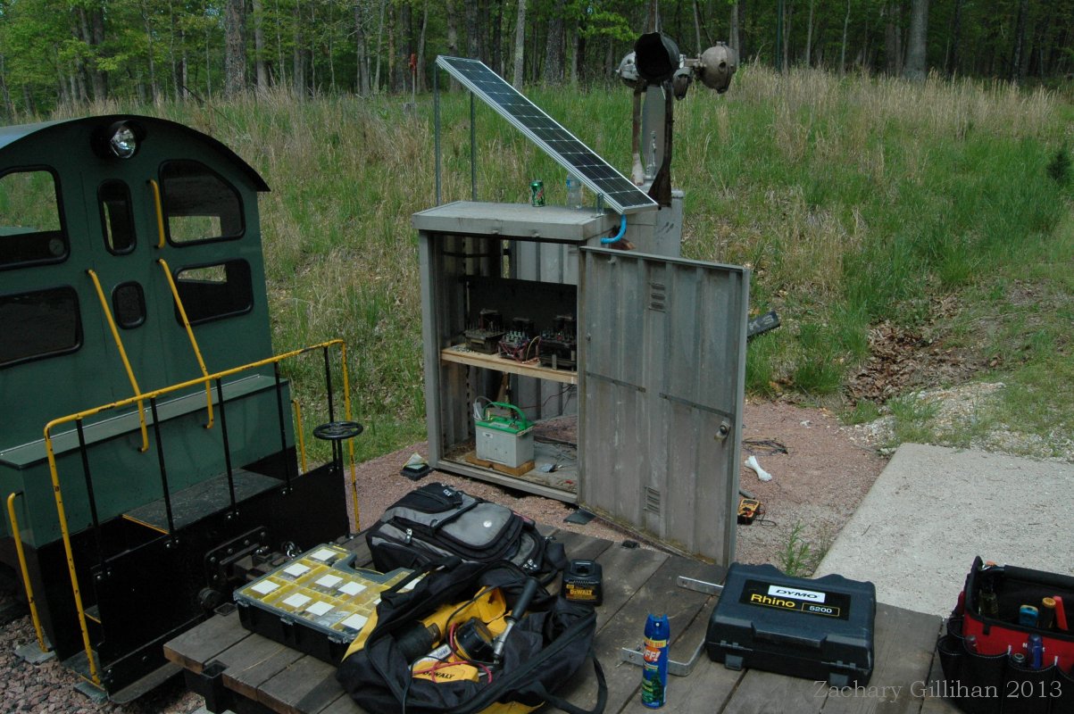 Today's workday was to install the Griswold Tee Bracket and the lights. Also to finsh the wiring in the cabinet and to replace the sensors. The River Road crossing does not have access to 110VAC or 220VAC, so the crossing requires solar panel and a battery to operate. The crossing also goes through a road and the track was not bonded when it was installed. We used Allen Bradley Photosensors to detect the train, there is a uphill and downhill sensor that starts a latching circuit and a timer that when it times out it resets the circuit until the sensors are activated. The other side of the crossing will also have another griswold but it will just be griswold and lights with out the stopsign until we find or make a motor for the signal. The plan is to just get this up and working and ten take it down after the friends meet and restore it.