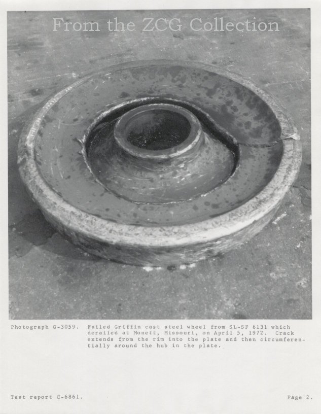 G-3059 Items: Wheel Date Taken: Note or Description: Failed Griffin cast steel wheel from SL-SF 6131 that caused a derailment at Monett, Mo on April 5th, 1972.