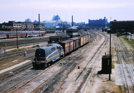 This view was taken on May 30th 1957, looking east from Jefferson Ave Viaduct. Train C&EI Number 200 passes Tower 2.