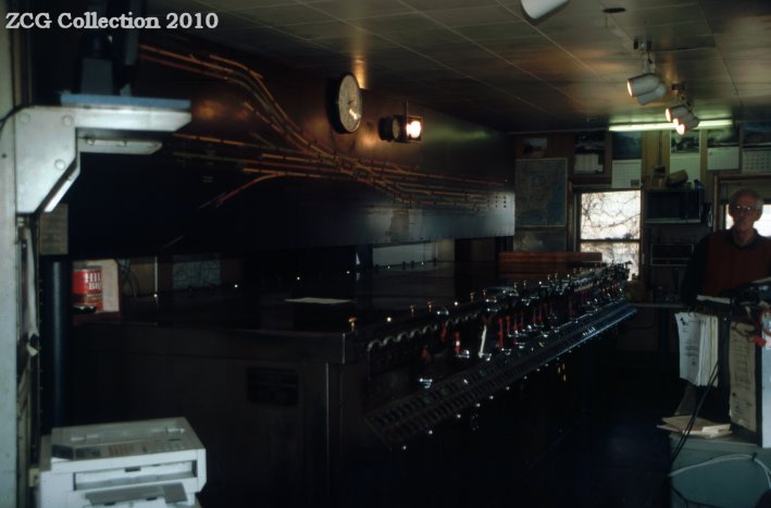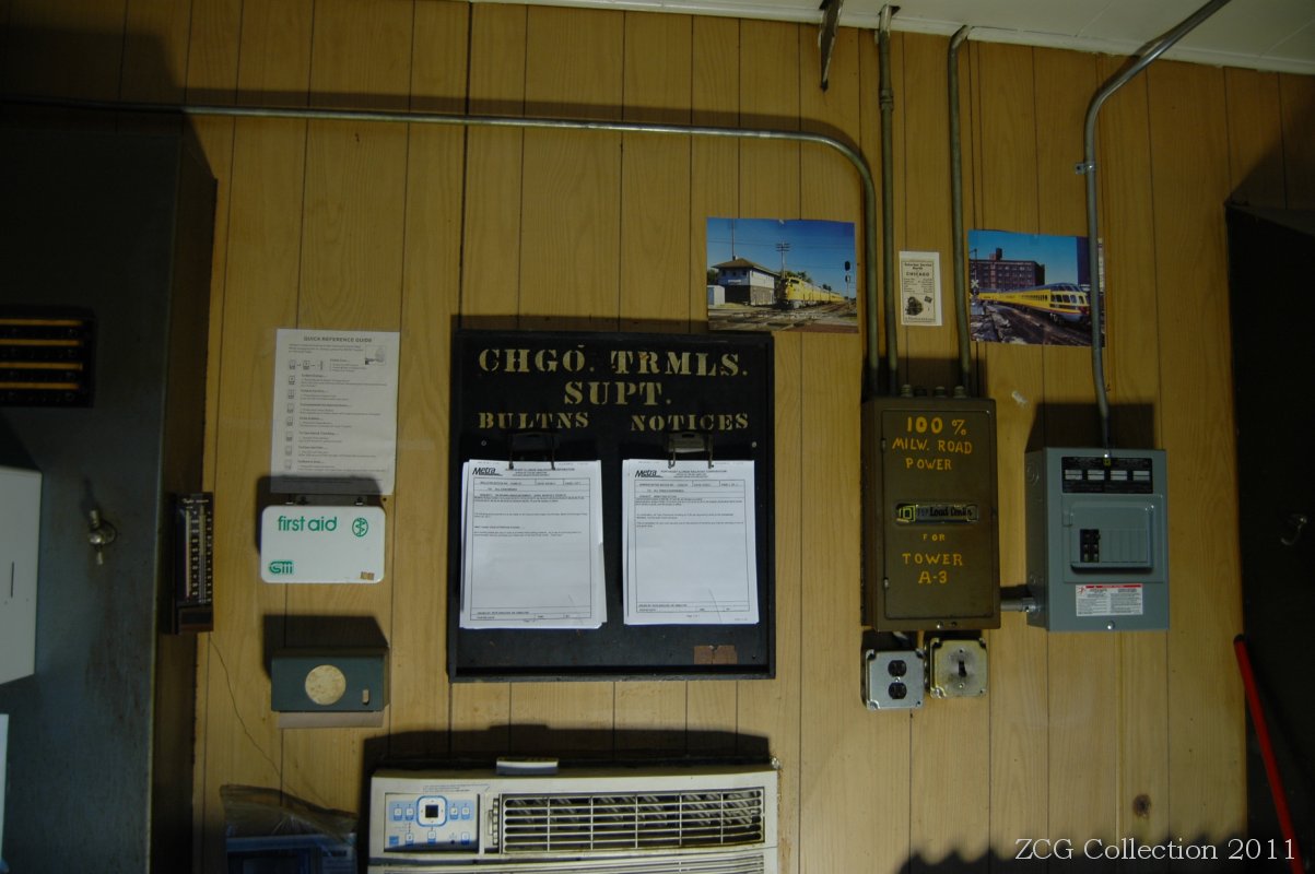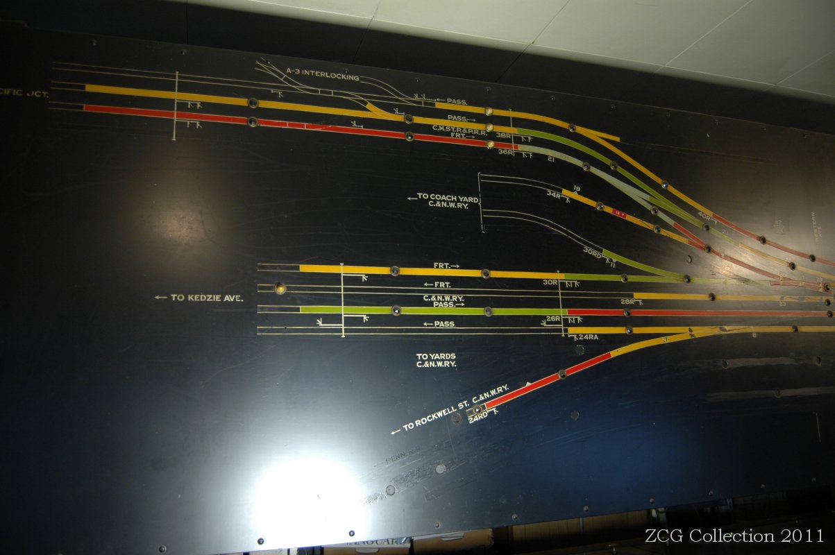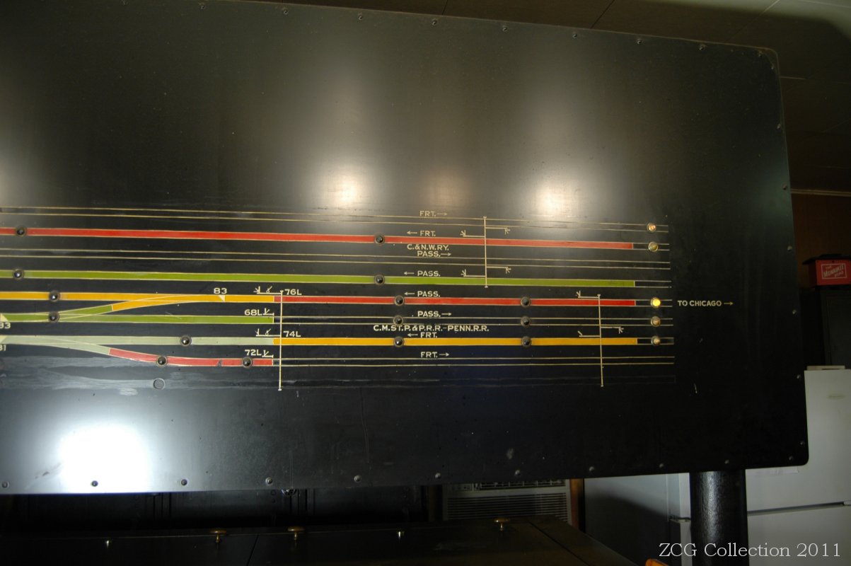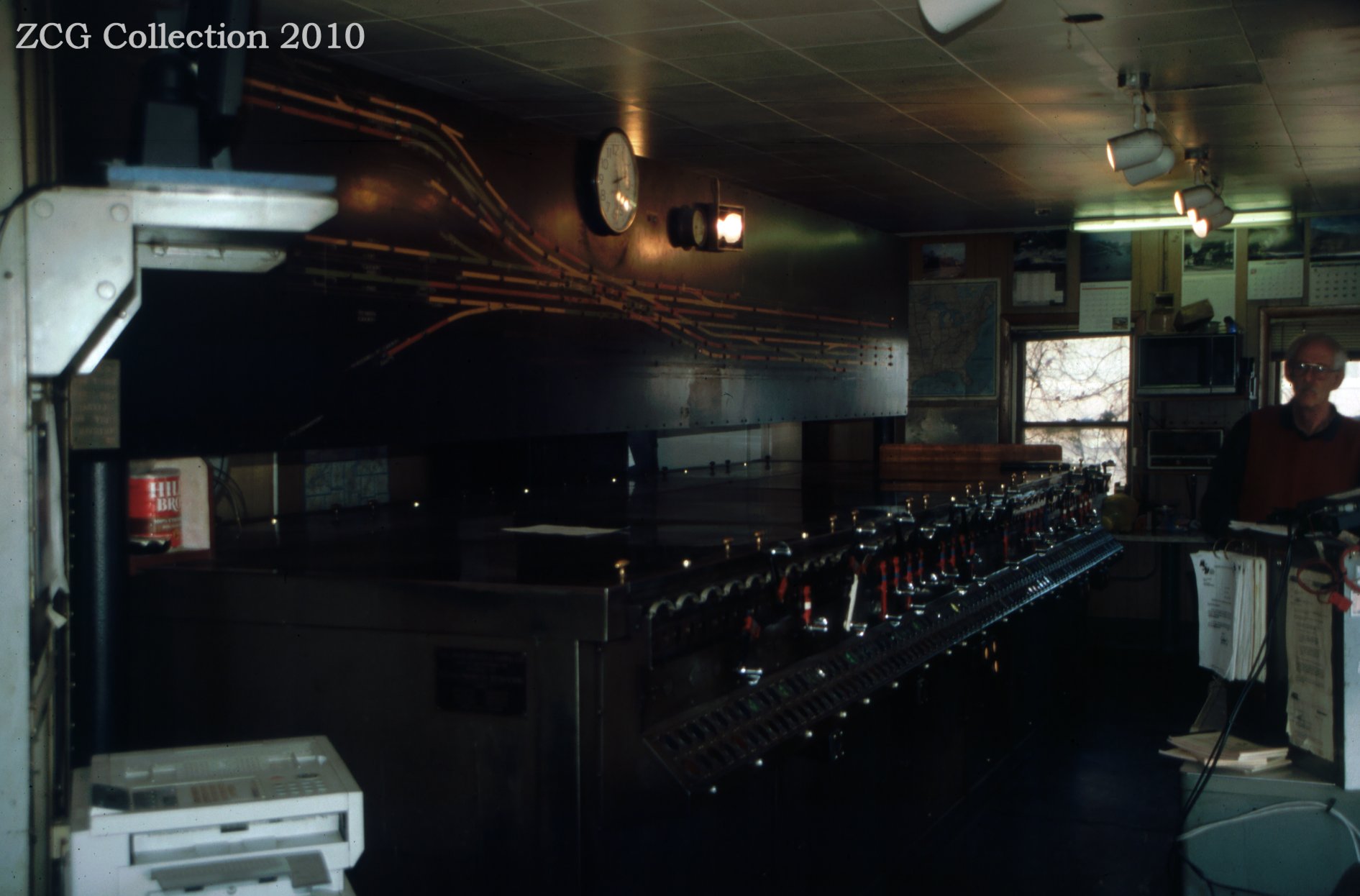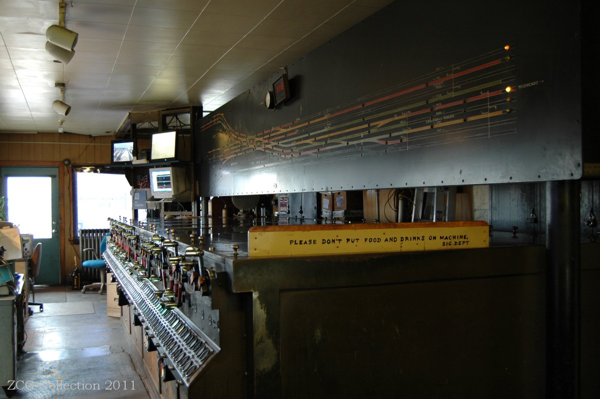 A2 tower was built by the Milwaukee Road in 1938 and built to the Pennsylvania Railroad specifications. The tower houses a Union Switch and Signal Company Model 14 interlocking machine. The machine is a electro-pneumatic interlocking machine with 83 lever spaces though not all the levers remain today.