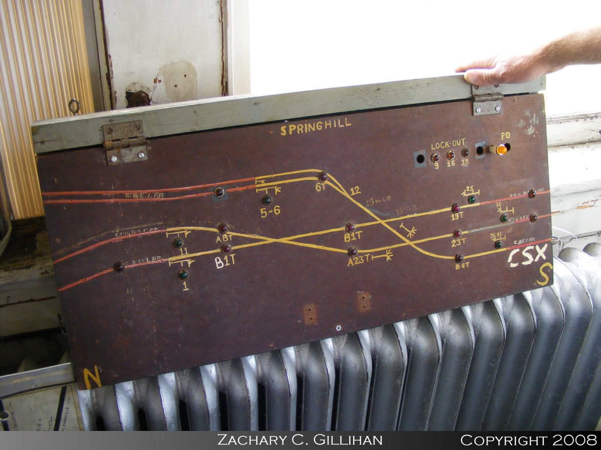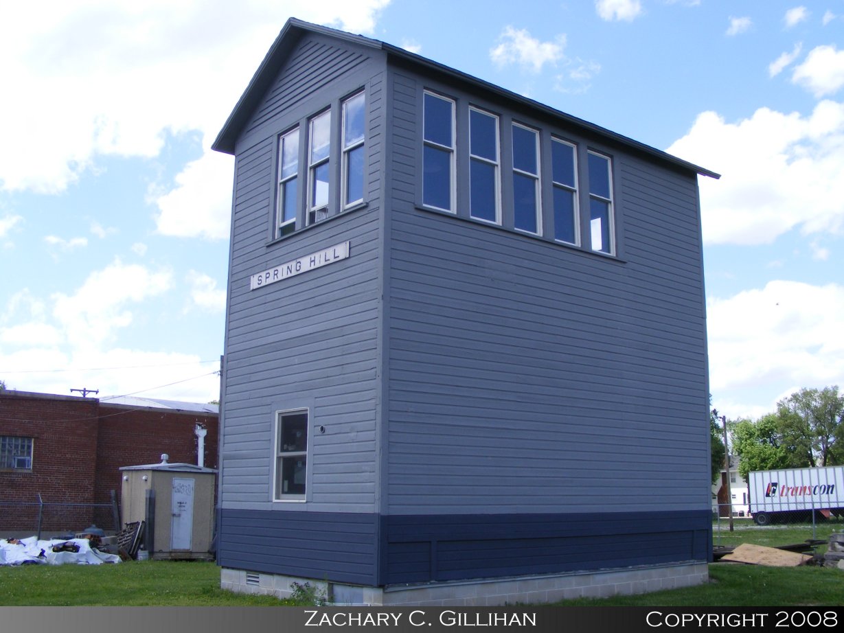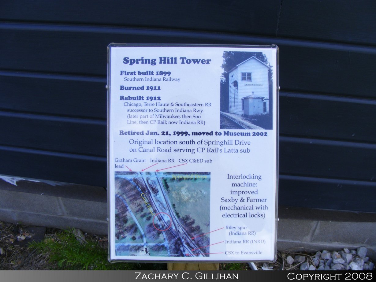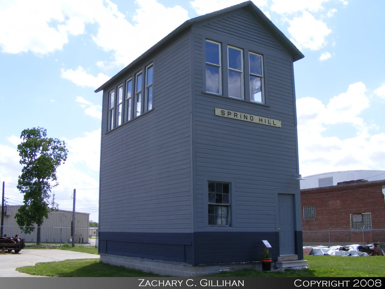 Spring Hill Tower was built in 1899 by the Southern Indiana Railway. It caught fire and was rebuilt in 1912. It houses a Saxby-Farmer 40 lever bed, though not all levers are there or installed. It was the last lever tower on the CP when it closed. The tower was closed January of 1999 and in 2001 the Haley Tower Historical & Technical Society, Incmoved it to the Wabash Valley Railroaders Museum. It currently resides there and can been seen every Saturday and Sunday through the months of May and October. The info about the Museum is below: