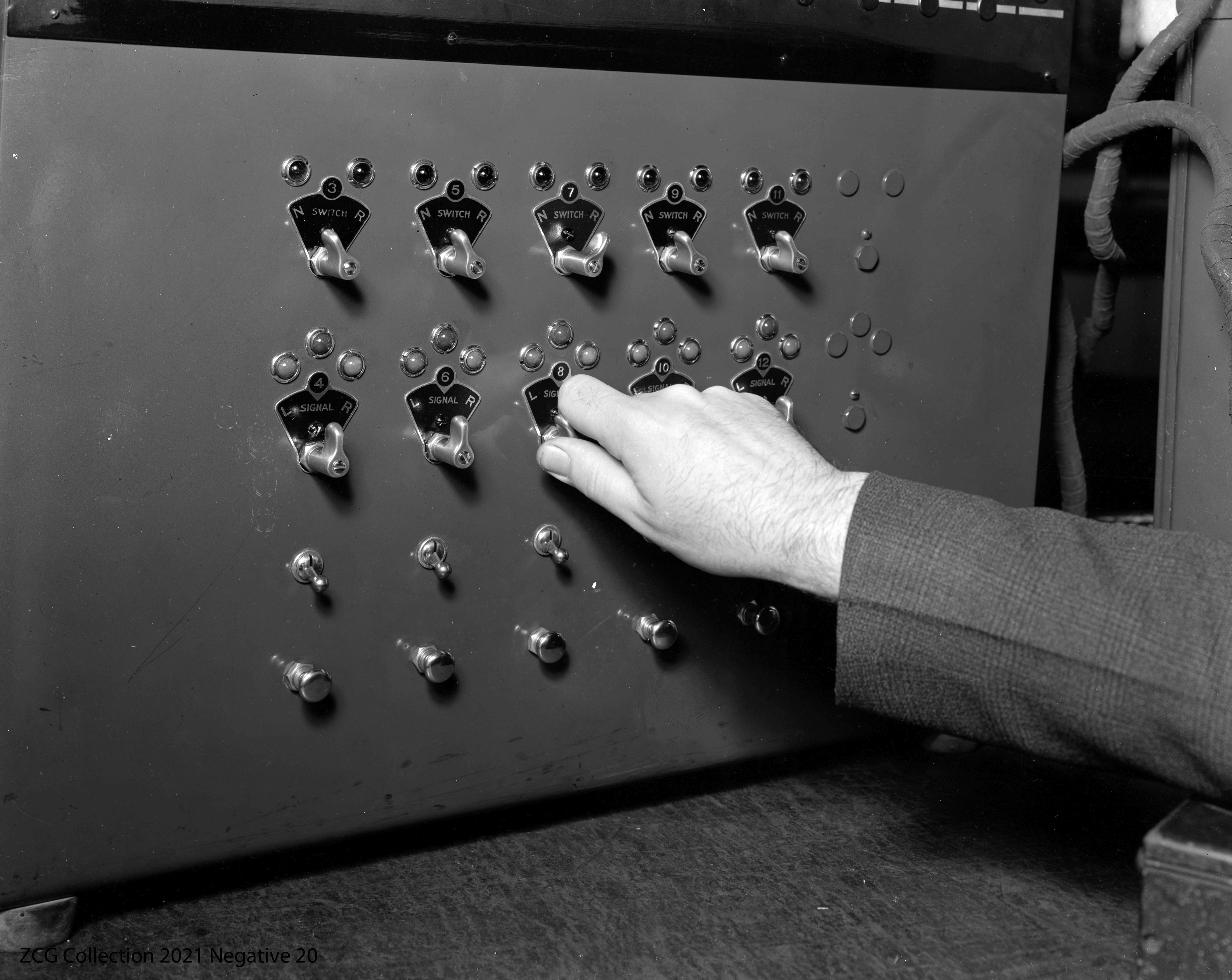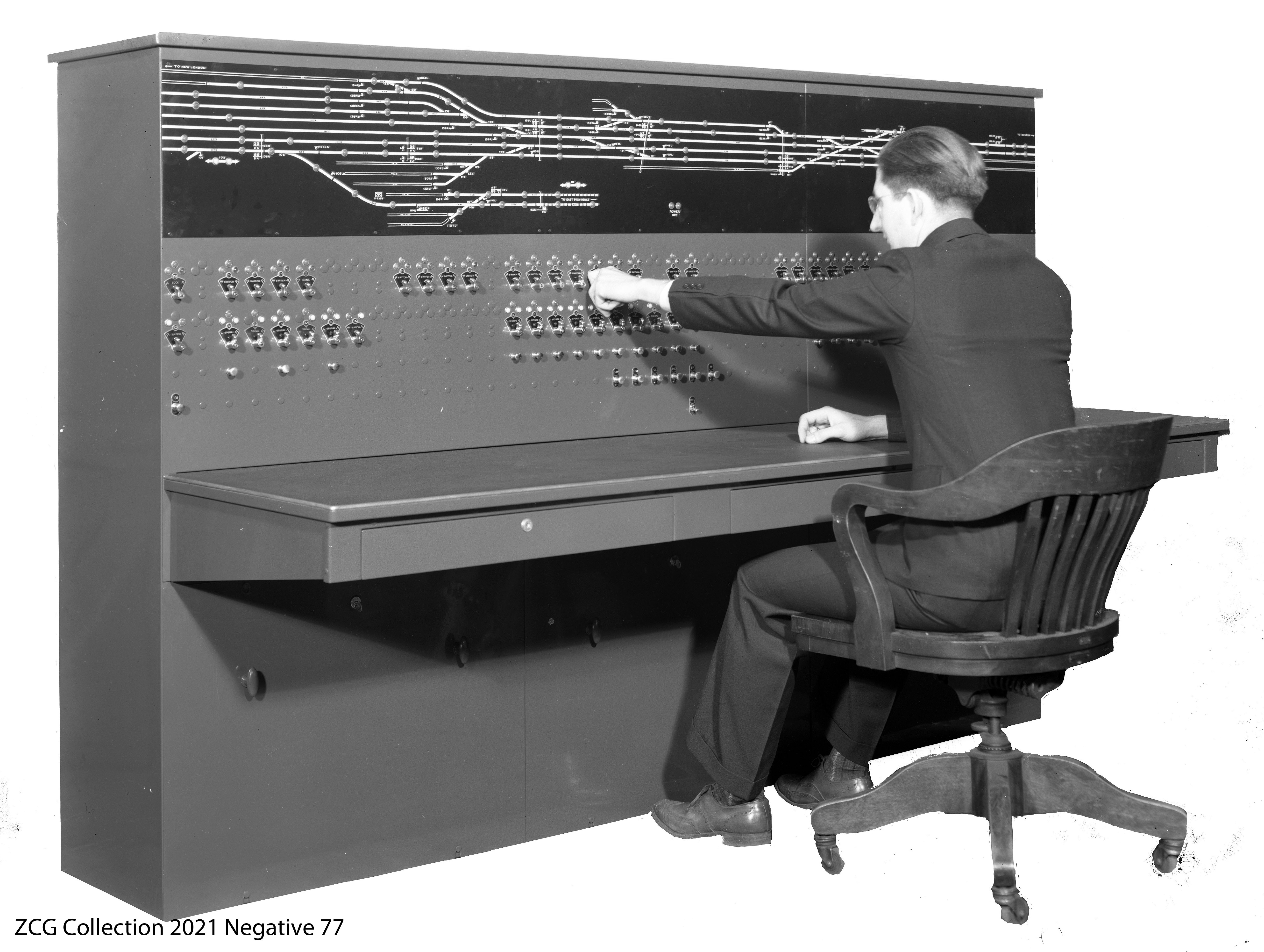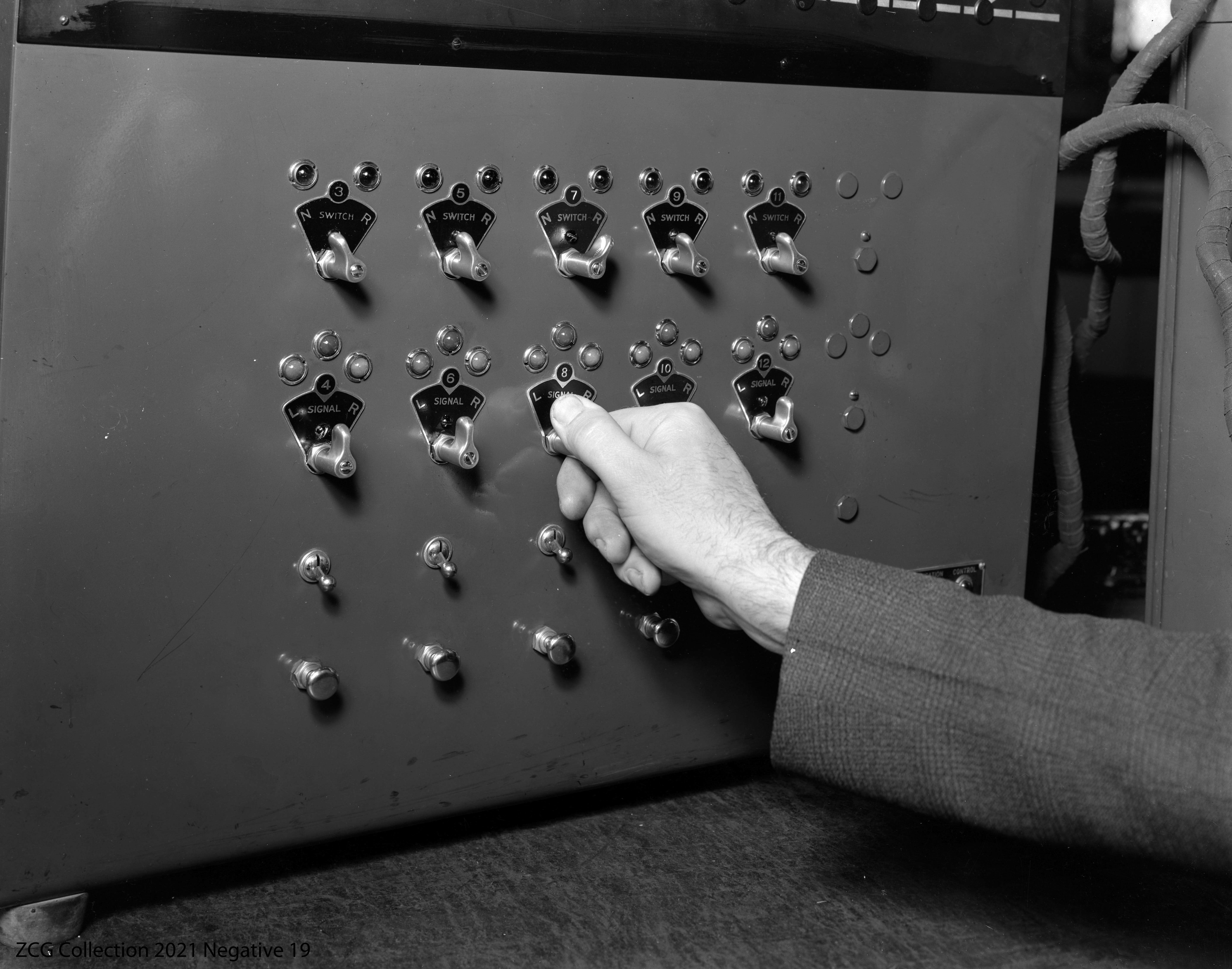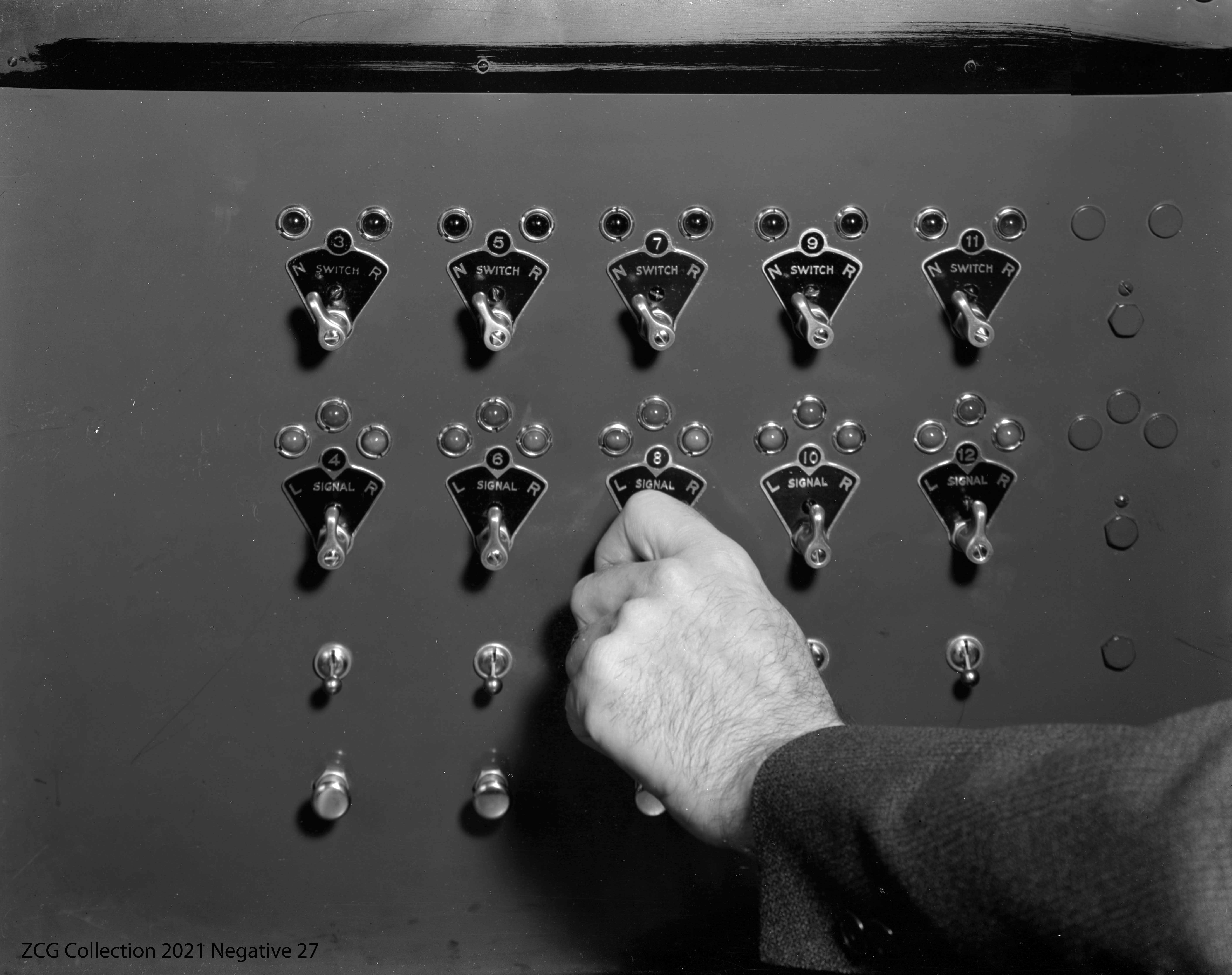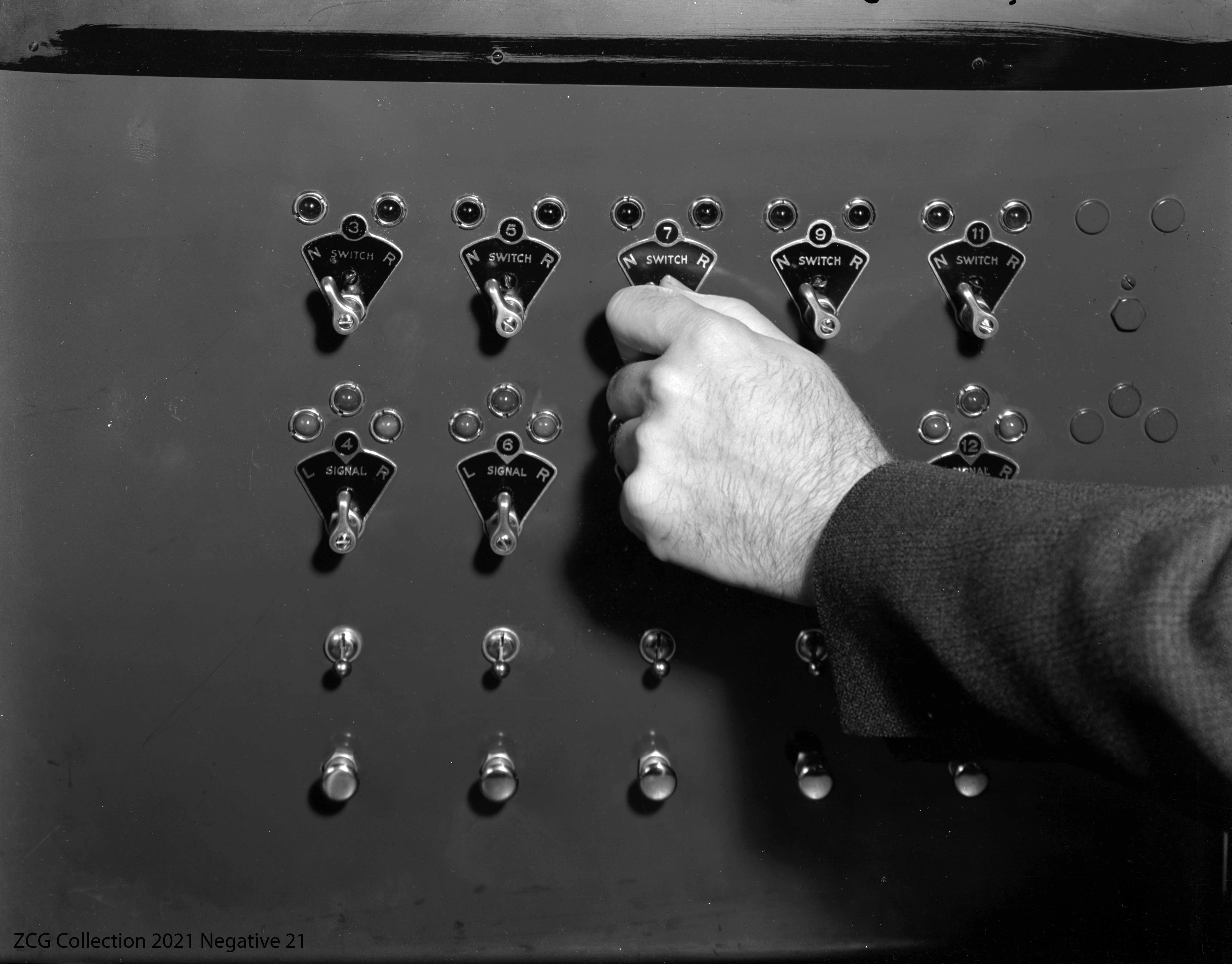 Close-Up of CTC Panel with Hand on Signal Lever |