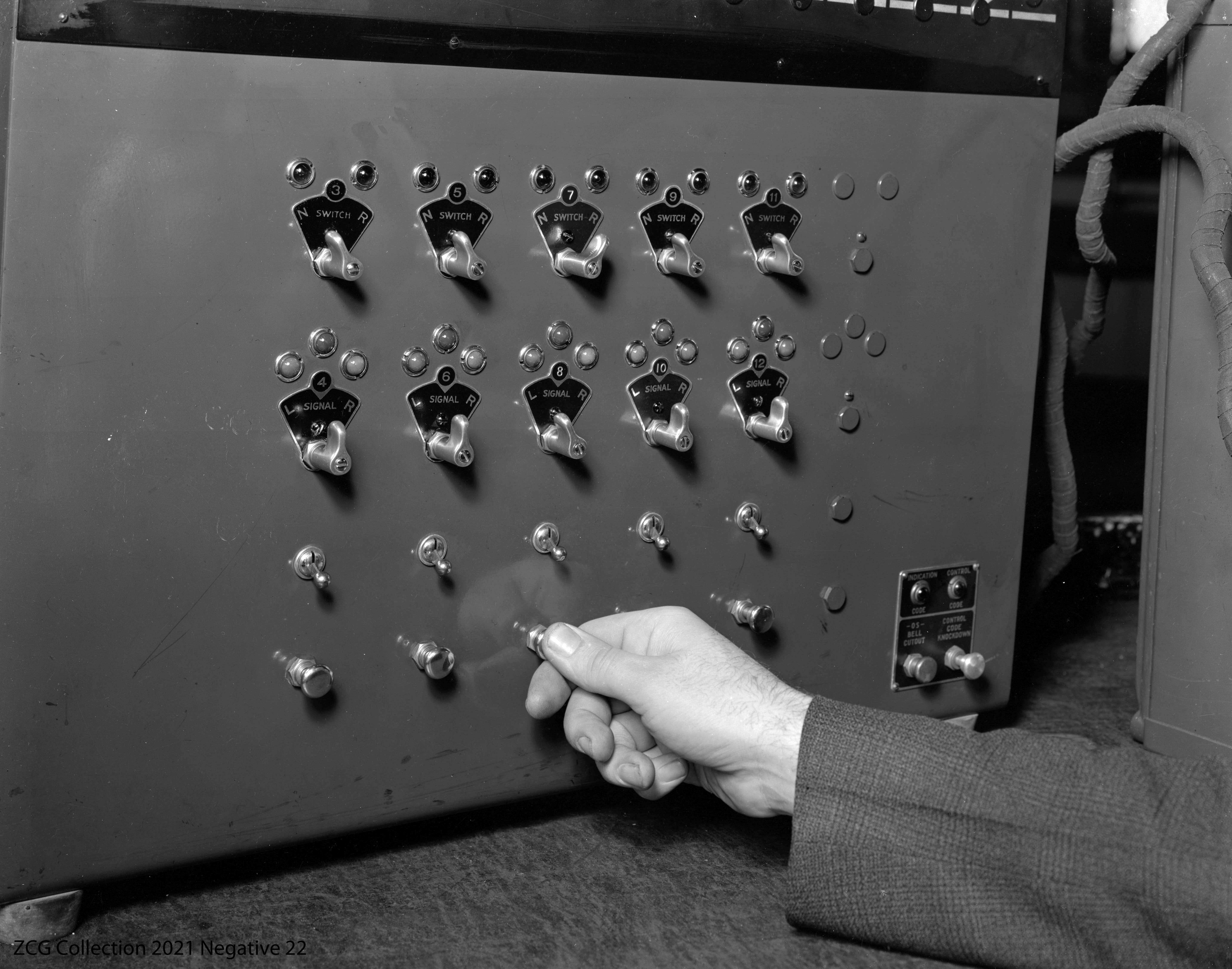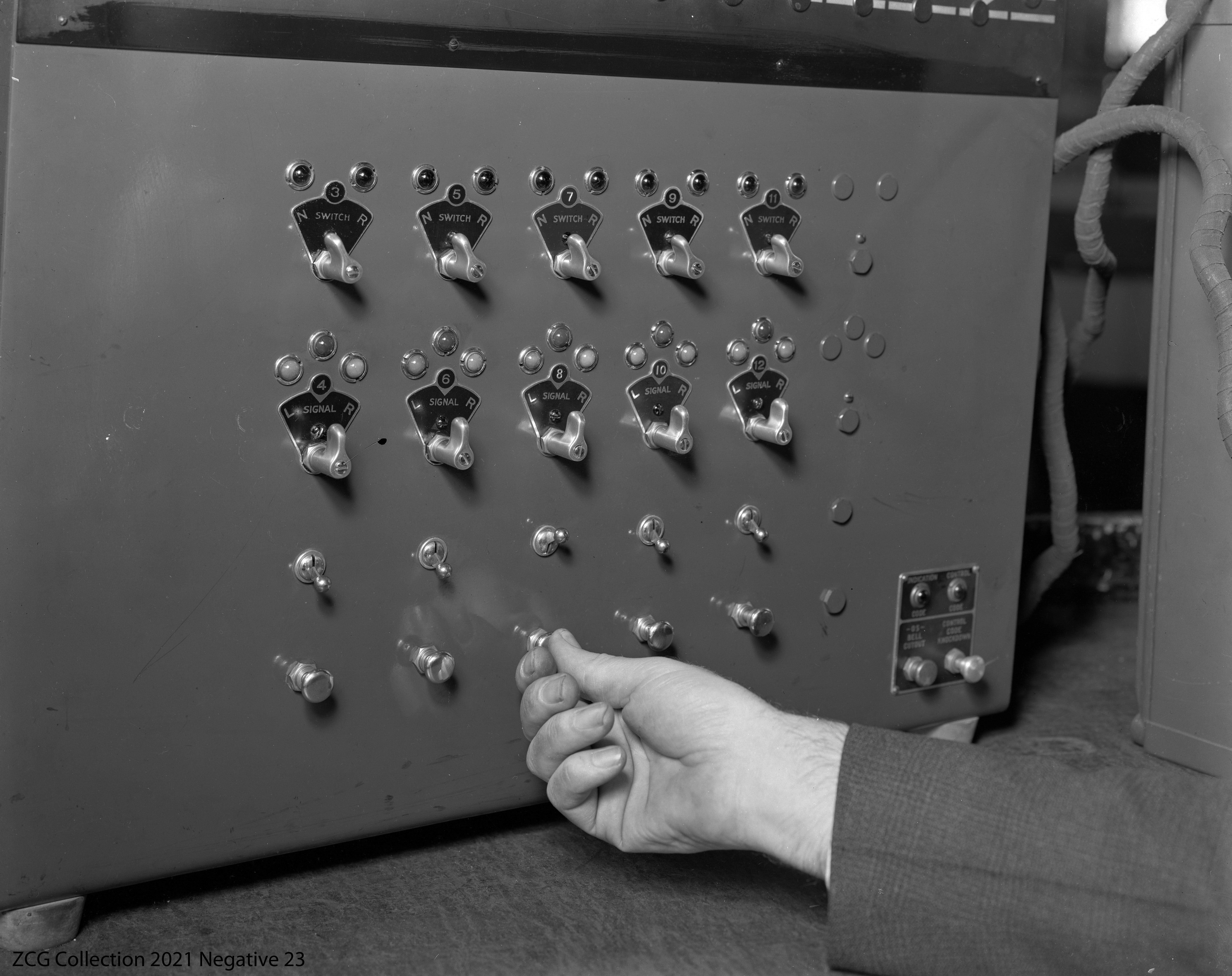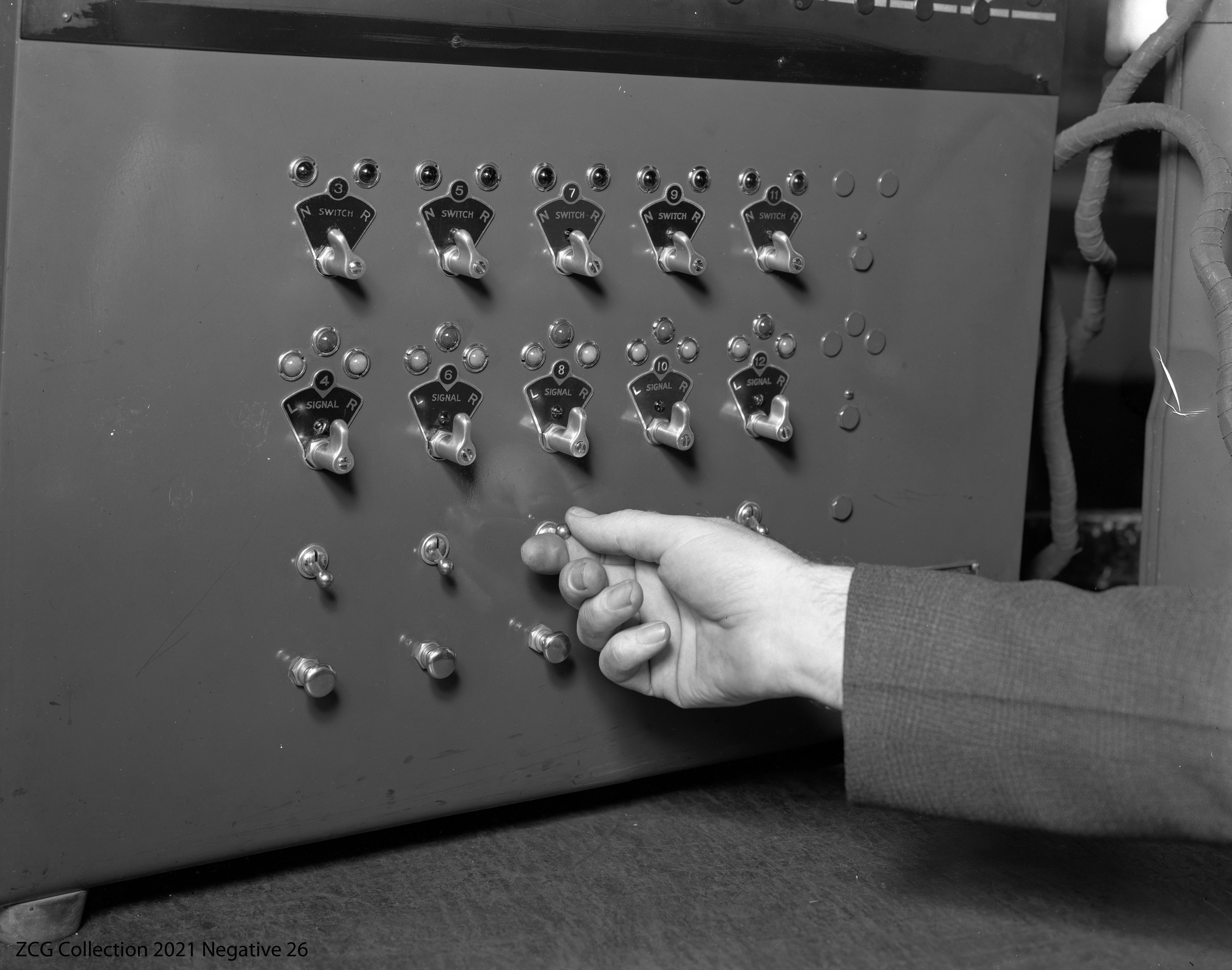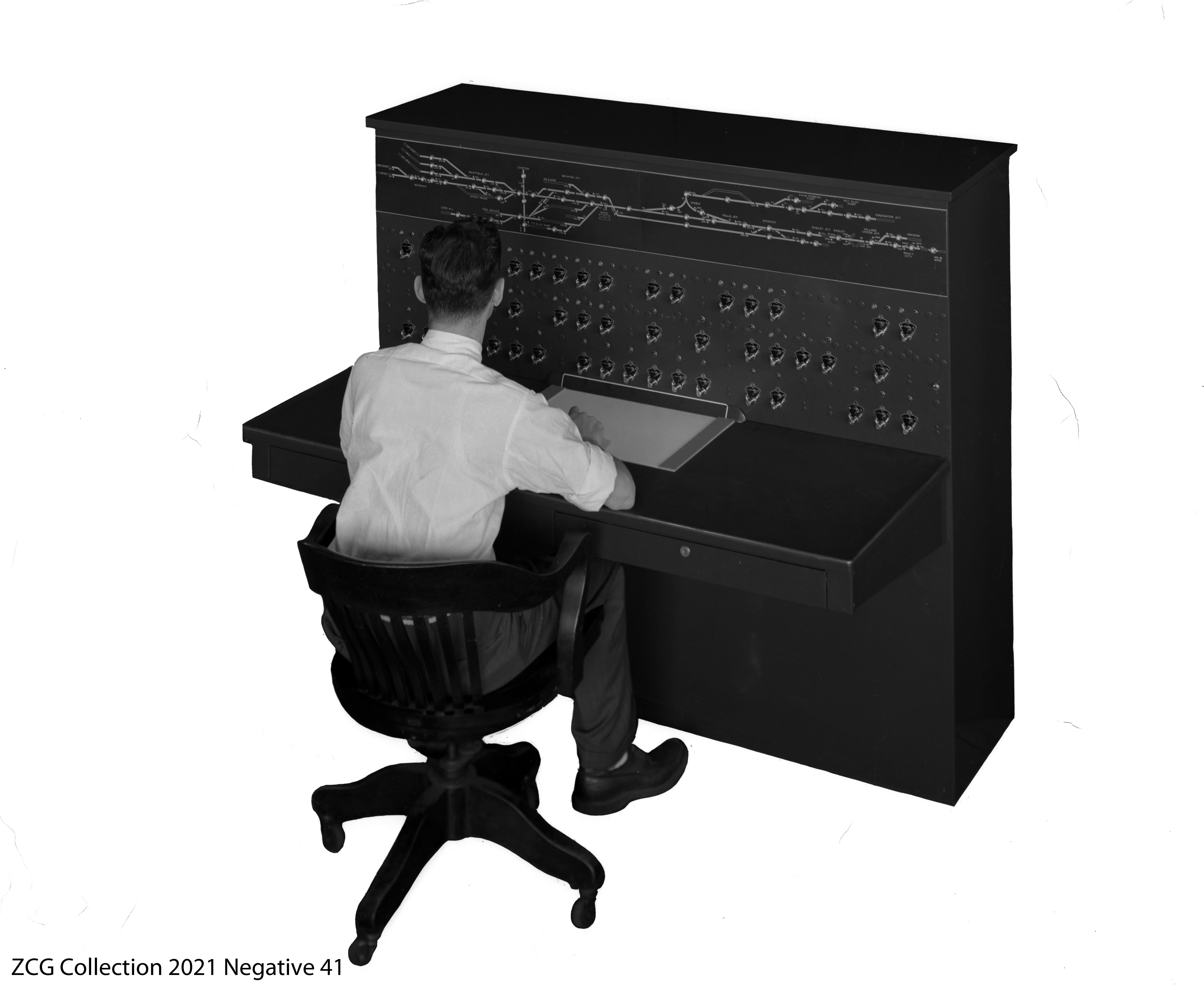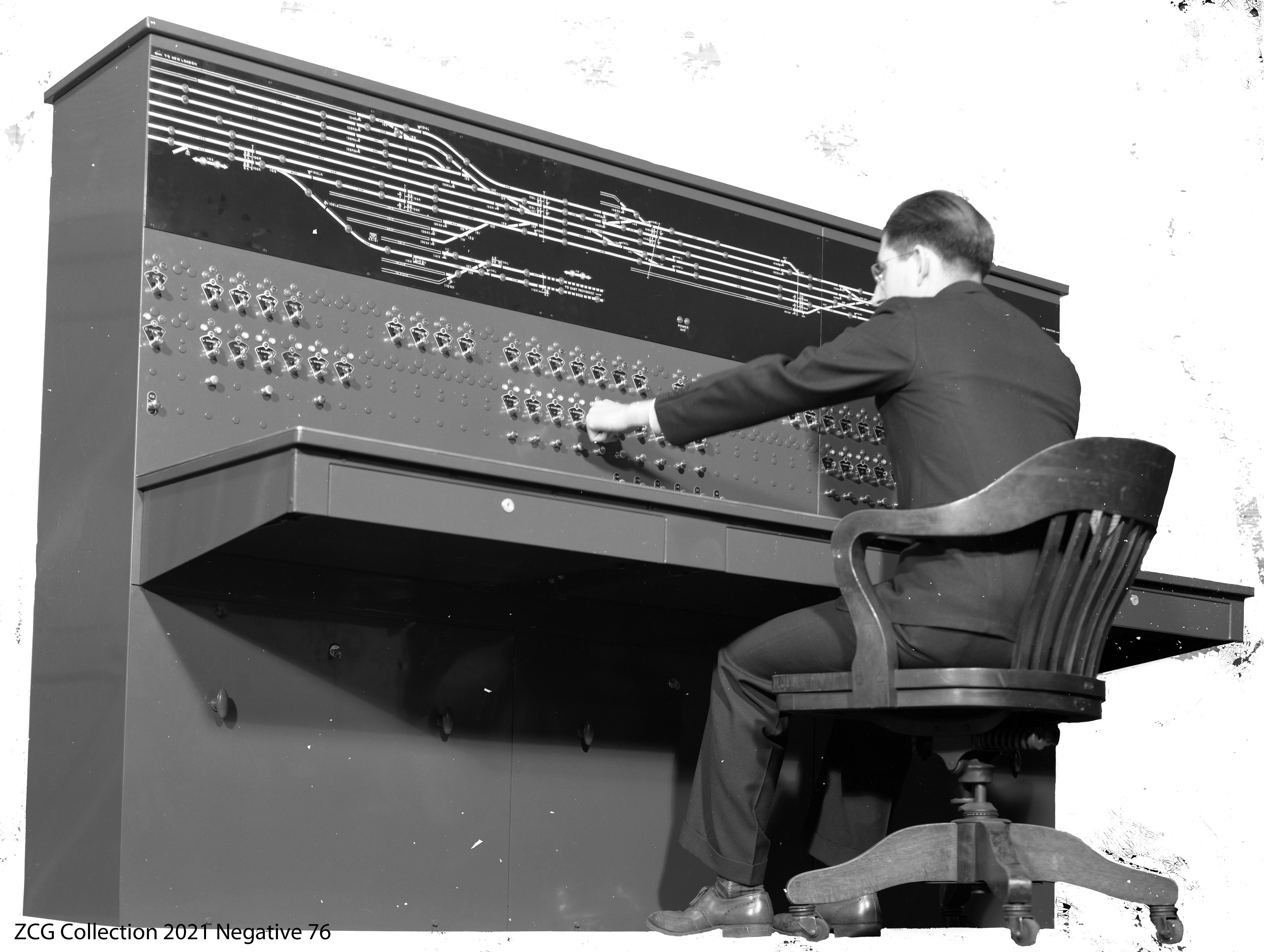 Close-Up of CTC Panel with Hand on Signal Lever |